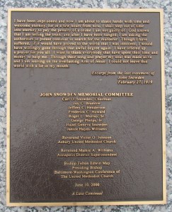Here’s an interesting article posted yesterday about John Snowden, who was hanged in Maryland in 1919 for murder based on shaky evidence. He was pardoned on grounds of possible innocence in 2001, and a memorial marker has been erected near his grave. His final words appear on the memorial marker, and they are as follows: